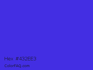 Hex #432ee3 Color is a normal indigo color and the nearest color is Palatinate Blue #273be2. Hex code #432ee3 and RGB value is rgb(67,46,227). In RGB color space, this color is composed of 26% red, 18% green, 89% blue, In CMYK color space, this color is composed of 70% cyan, 80% magenta, 0% yellow , 11% black , In HSL color space, this color has a hue angle of 247° , 76% saturation and 54% lightness.