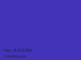 Hex #4333b8 Color is a normal indigo color and the nearest color is Ocean Blue #4f42b5. Hex code #4333b8 and RGB value is rgb(67,51,184). In RGB color space, this color is composed of 26% red, 20% green, 72% blue, In CMYK color space, this color is composed of 64% cyan, 72% magenta, 0% yellow , 28% black , In HSL color space, this color has a hue angle of 247° , 57% saturation and 46% lightness.