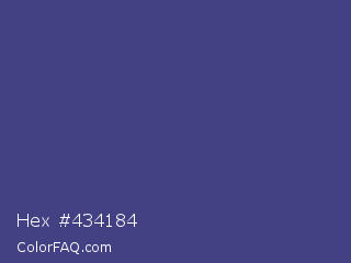 Hex #434184 Color is a normal indigo color and the nearest color is Dark Slate Blue #483d8b. Hex code #434184 and RGB value is rgb(67,65,132). In RGB color space, this color is composed of 26% red, 25% green, 52% blue, In CMYK color space, this color is composed of 49% cyan, 51% magenta, 0% yellow , 48% black , In HSL color space, this color has a hue angle of 242° , 34% saturation and 39% lightness.