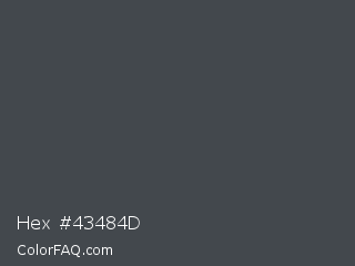 Hex #43484d Color is a dark blue color and the nearest color is Outer Space #414a4c. Hex code #43484d and RGB value is rgb(67,72,77). In RGB color space, this color is composed of 26% red, 28% green, 30% blue, In CMYK color space, this color is composed of 13% cyan, 6% magenta, 0% yellow , 70% black , In HSL color space, this color has a hue angle of 210° , 7% saturation and 28% lightness.