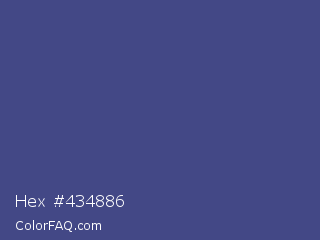 Hex #434886 Color is a normal blue color and the nearest color is East Bay #414c7d. Hex code #434886 and RGB value is rgb(67,72,134). In RGB color space, this color is composed of 26% red, 28% green, 53% blue, In CMYK color space, this color is composed of 50% cyan, 46% magenta, 0% yellow , 47% black , In HSL color space, this color has a hue angle of 236° , 33% saturation and 39% lightness.