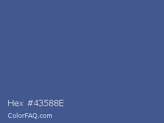 Hex #43588e Color is a normal blue color and the nearest color is Chambray #354e8c. Hex code #43588e and RGB value is rgb(67,88,142). In RGB color space, this color is composed of 26% red, 35% green, 56% blue, In CMYK color space, this color is composed of 53% cyan, 38% magenta, 0% yellow , 44% black , In HSL color space, this color has a hue angle of 223° , 36% saturation and 41% lightness.