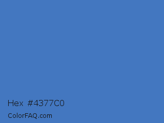 Hex #4377c0 Color is a normal blue color and the nearest color is Cyan Blue Azure #4682bf. Hex code #4377c0 and RGB value is rgb(67,119,192). In RGB color space, this color is composed of 26% red, 47% green, 75% blue, In CMYK color space, this color is composed of 65% cyan, 38% magenta, 0% yellow , 25% black , In HSL color space, this color has a hue angle of 215° , 50% saturation and 51% lightness.