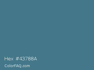 Hex #43788a Color is a normal blue color and the nearest color is Bismark #497183. Hex code #43788a and RGB value is rgb(67,120,138). In RGB color space, this color is composed of 26% red, 47% green, 54% blue, In CMYK color space, this color is composed of 51% cyan, 13% magenta, 0% yellow , 46% black , In HSL color space, this color has a hue angle of 195° , 35% saturation and 40% lightness.