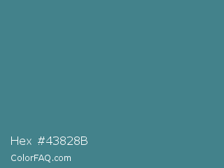 Hex #43828b Color is a normal cyan color and the nearest color is Smalt Blue #51808f. Hex code #43828b and RGB value is rgb(67,130,139). In RGB color space, this color is composed of 26% red, 51% green, 55% blue, In CMYK color space, this color is composed of 52% cyan, 6% magenta, 0% yellow , 45% black , In HSL color space, this color has a hue angle of 188° , 35% saturation and 40% lightness.