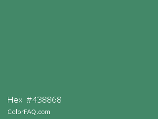 Hex #438868 Color is a normal green color and the nearest color is Viridian #40826d. Hex code #438868 and RGB value is rgb(67,136,104). In RGB color space, this color is composed of 26% red, 53% green, 41% blue, In CMYK color space, this color is composed of 51% cyan, 0% magenta, 24% yellow , 47% black , In HSL color space, this color has a hue angle of 152° , 34% saturation and 40% lightness.