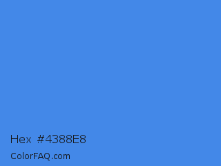 Hex #4388e8 Color is a normal blue color and the nearest color is Tufts Blue #3e8ede. Hex code #4388e8 and RGB value is rgb(67,136,232). In RGB color space, this color is composed of 26% red, 53% green, 91% blue, In CMYK color space, this color is composed of 71% cyan, 41% magenta, 0% yellow , 9% black , In HSL color space, this color has a hue angle of 215° , 78% saturation and 59% lightness.