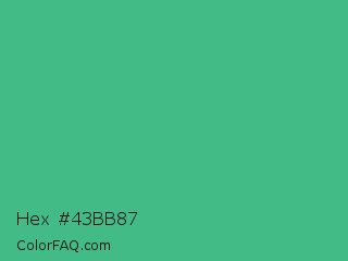 Hex #43bb87 Color is a normal green color and the nearest color is Mint #3eb489. Hex code #43bb87 and RGB value is rgb(67,187,135). In RGB color space, this color is composed of 26% red, 73% green, 53% blue, In CMYK color space, this color is composed of 64% cyan, 0% magenta, 28% yellow , 27% black , In HSL color space, this color has a hue angle of 154° , 47% saturation and 50% lightness.