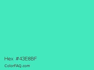 Hex #43e8bf Color is a normal cyan color and the nearest color is Turquoise #40e0d0. Hex code #43e8bf and RGB value is rgb(67,232,191). In RGB color space, this color is composed of 26% red, 91% green, 75% blue, In CMYK color space, this color is composed of 71% cyan, 0% magenta, 18% yellow , 9% black , In HSL color space, this color has a hue angle of 165° , 78% saturation and 59% lightness.
