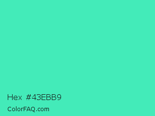 Hex #43ebb9 Color is a normal green color and the nearest color is Turquoise #40e0d0. Hex code #43ebb9 and RGB value is rgb(67,235,185). In RGB color space, this color is composed of 26% red, 92% green, 73% blue, In CMYK color space, this color is composed of 71% cyan, 0% magenta, 21% yellow , 8% black , In HSL color space, this color has a hue angle of 162° , 81% saturation and 59% lightness.