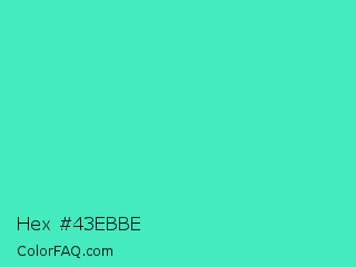 Hex #43ebbe Color is a normal cyan color and the nearest color is Turquoise #40e0d0. Hex code #43ebbe and RGB value is rgb(67,235,190). In RGB color space, this color is composed of 26% red, 92% green, 75% blue, In CMYK color space, this color is composed of 71% cyan, 0% magenta, 19% yellow , 8% black , In HSL color space, this color has a hue angle of 164° , 81% saturation and 59% lightness.