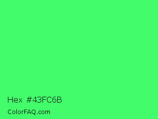 Hex #43fc6b Color is a light green color and the nearest color is Screamin Green #66ff66. Hex code #43fc6b and RGB value is rgb(67,252,107). In RGB color space, this color is composed of 26% red, 99% green, 42% blue, In CMYK color space, this color is composed of 73% cyan, 0% magenta, 58% yellow , 1% black , In HSL color space, this color has a hue angle of 133° , 97% saturation and 63% lightness.