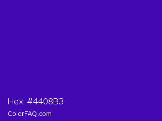 Hex #4408b3 Color is a normal violet color and the nearest color is Interdimensional Blue #360ccc. Hex code #4408b3 and RGB value is rgb(68,8,179). In RGB color space, this color is composed of 27% red, 3% green, 70% blue, In CMYK color space, this color is composed of 62% cyan, 96% magenta, 0% yellow , 30% black , In HSL color space, this color has a hue angle of 261° , 91% saturation and 37% lightness.