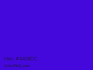 Hex #4408dc Color is a normal indigo color and the nearest color is Interdimensional Blue #360ccc. Hex code #4408dc and RGB value is rgb(68,8,220). In RGB color space, this color is composed of 27% red, 3% green, 86% blue, In CMYK color space, this color is composed of 69% cyan, 96% magenta, 0% yellow , 14% black , In HSL color space, this color has a hue angle of 257° , 93% saturation and 45% lightness.