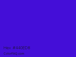 Hex #440ed8 Color is a normal indigo color and the nearest color is Interdimensional Blue #360ccc. Hex code #440ed8 and RGB value is rgb(68,14,216). In RGB color space, this color is composed of 27% red, 5% green, 85% blue, In CMYK color space, this color is composed of 69% cyan, 94% magenta, 0% yellow , 15% black , In HSL color space, this color has a hue angle of 256° , 88% saturation and 45% lightness.