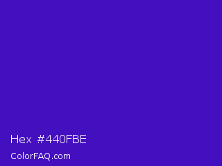 Hex #440fbe Color is a normal indigo color and the nearest color is Interdimensional Blue #360ccc. Hex code #440fbe and RGB value is rgb(68,15,190). In RGB color space, this color is composed of 27% red, 6% green, 75% blue, In CMYK color space, this color is composed of 64% cyan, 92% magenta, 0% yellow , 25% black , In HSL color space, this color has a hue angle of 258° , 85% saturation and 40% lightness.