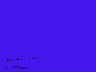 Hex #4416eb Color is a normal indigo color and the nearest color is Han Purple #5218fa. Hex code #4416eb and RGB value is rgb(68,22,235). In RGB color space, this color is composed of 27% red, 9% green, 92% blue, In CMYK color space, this color is composed of 71% cyan, 91% magenta, 0% yellow , 8% black , In HSL color space, this color has a hue angle of 253° , 84% saturation and 50% lightness.