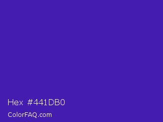 Hex #441db0 Color is a normal indigo color and the nearest color is Daisy Bush #4f2398. Hex code #441db0 and RGB value is rgb(68,29,176). In RGB color space, this color is composed of 27% red, 11% green, 69% blue, In CMYK color space, this color is composed of 61% cyan, 84% magenta, 0% yellow , 31% black , In HSL color space, this color has a hue angle of 256° , 72% saturation and 40% lightness.