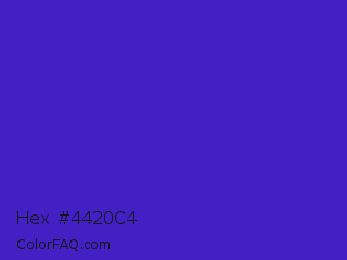 Hex #4420c4 Color is a normal indigo color and the nearest color is Interdimensional Blue #360ccc. Hex code #4420c4 and RGB value is rgb(68,32,196). In RGB color space, this color is composed of 27% red, 13% green, 77% blue, In CMYK color space, this color is composed of 65% cyan, 84% magenta, 0% yellow , 23% black , In HSL color space, this color has a hue angle of 253° , 72% saturation and 45% lightness.