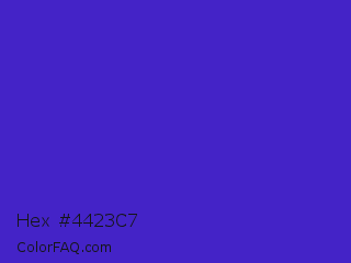 Hex #4423c7 Color is a normal indigo color and the nearest color is Interdimensional Blue #360ccc. Hex code #4423c7 and RGB value is rgb(68,35,199). In RGB color space, this color is composed of 27% red, 14% green, 78% blue, In CMYK color space, this color is composed of 66% cyan, 82% magenta, 0% yellow , 22% black , In HSL color space, this color has a hue angle of 252° , 70% saturation and 46% lightness.