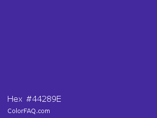 Hex #44289e Color is a normal indigo color and the nearest color is Daisy Bush #4f2398. Hex code #44289e and RGB value is rgb(68,40,158). In RGB color space, this color is composed of 27% red, 16% green, 62% blue, In CMYK color space, this color is composed of 57% cyan, 75% magenta, 0% yellow , 38% black , In HSL color space, this color has a hue angle of 254° , 60% saturation and 39% lightness.