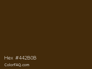 Hex #442b0b Color is a very dark orange color and the nearest color is Bracken #4a2a04. Hex code #442b0b and RGB value is rgb(68,43,11). In RGB color space, this color is composed of 27% red, 17% green, 4% blue, In CMYK color space, this color is composed of 0% cyan, 37% magenta, 84% yellow , 73% black , In HSL color space, this color has a hue angle of 34° , 72% saturation and 15% lightness.