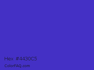 Hex #4430c5 Color is a normal indigo color and the nearest color is Ocean Blue #4f42b5. Hex code #4430c5 and RGB value is rgb(68,48,197). In RGB color space, this color is composed of 27% red, 19% green, 77% blue, In CMYK color space, this color is composed of 65% cyan, 76% magenta, 0% yellow , 23% black , In HSL color space, this color has a hue angle of 248° , 61% saturation and 48% lightness.