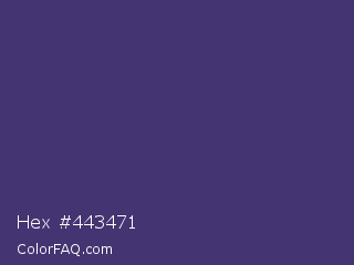 Hex #443471 Color is a normal indigo color and the nearest color is Minsk #3f307f. Hex code #443471 and RGB value is rgb(68,52,113). In RGB color space, this color is composed of 27% red, 20% green, 44% blue, In CMYK color space, this color is composed of 40% cyan, 54% magenta, 0% yellow , 56% black , In HSL color space, this color has a hue angle of 256° , 37% saturation and 32% lightness.