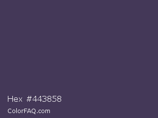 Hex #443858 Color is a dark violet color and the nearest color is Gun Powder #414257. Hex code #443858 and RGB value is rgb(68,56,88). In RGB color space, this color is composed of 27% red, 22% green, 35% blue, In CMYK color space, this color is composed of 23% cyan, 36% magenta, 0% yellow , 65% black , In HSL color space, this color has a hue angle of 263° , 22% saturation and 28% lightness.