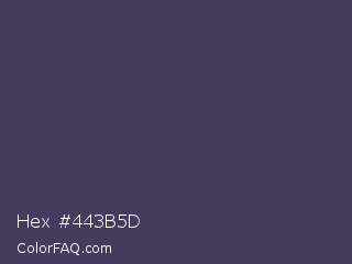 Hex #443b5d Color is a dark indigo color and the nearest color is Gun Powder #414257. Hex code #443b5d and RGB value is rgb(68,59,93). In RGB color space, this color is composed of 27% red, 23% green, 36% blue, In CMYK color space, this color is composed of 27% cyan, 37% magenta, 0% yellow , 64% black , In HSL color space, this color has a hue angle of 256° , 22% saturation and 30% lightness.