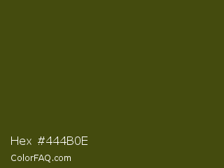 Hex #444b0e Color is a very dark yellow color and the nearest color is Clover #384910. Hex code #444b0e and RGB value is rgb(68,75,14). In RGB color space, this color is composed of 27% red, 29% green, 5% blue, In CMYK color space, this color is composed of 9% cyan, 0% magenta, 81% yellow , 71% black , In HSL color space, this color has a hue angle of 67° , 69% saturation and 17% lightness.