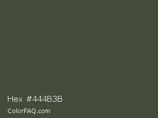 Hex #444b3b Color is a dark green color and the nearest color is Rifle Green #444c38. Hex code #444b3b and RGB value is rgb(68,75,59). In RGB color space, this color is composed of 27% red, 29% green, 23% blue, In CMYK color space, this color is composed of 9% cyan, 0% magenta, 21% yellow , 71% black , In HSL color space, this color has a hue angle of 86° , 12% saturation and 26% lightness.