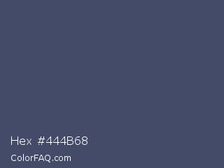 Hex #444b68 Color is a normal blue color and the nearest color is Fiord #405169. Hex code #444b68 and RGB value is rgb(68,75,104). In RGB color space, this color is composed of 27% red, 29% green, 41% blue, In CMYK color space, this color is composed of 35% cyan, 28% magenta, 0% yellow , 59% black , In HSL color space, this color has a hue angle of 228° , 21% saturation and 34% lightness.