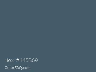 Hex #445b69 Color is a normal blue color and the nearest color is Fiord #405169. Hex code #445b69 and RGB value is rgb(68,91,105). In RGB color space, this color is composed of 27% red, 36% green, 41% blue, In CMYK color space, this color is composed of 35% cyan, 13% magenta, 0% yellow , 59% black , In HSL color space, this color has a hue angle of 203° , 21% saturation and 34% lightness.