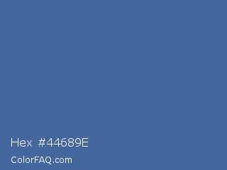 Hex #44689e Color is a normal blue color and the nearest color is Queen Blue #436b95. Hex code #44689e and RGB value is rgb(68,104,158). In RGB color space, this color is composed of 27% red, 41% green, 62% blue, In CMYK color space, this color is composed of 57% cyan, 34% magenta, 0% yellow , 38% black , In HSL color space, this color has a hue angle of 216° , 40% saturation and 44% lightness.