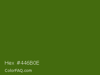 Hex #446b0e Color is a dark green color and the nearest color is Green Leaf #436a0d. Hex code #446b0e and RGB value is rgb(68,107,14). In RGB color space, this color is composed of 27% red, 42% green, 5% blue, In CMYK color space, this color is composed of 36% cyan, 0% magenta, 87% yellow , 58% black , In HSL color space, this color has a hue angle of 85° , 77% saturation and 24% lightness.