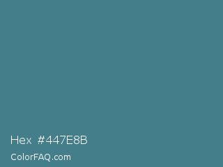 Hex #447e8b Color is a normal cyan color and the nearest color is Smalt Blue #51808f. Hex code #447e8b and RGB value is rgb(68,126,139). In RGB color space, this color is composed of 27% red, 49% green, 55% blue, In CMYK color space, this color is composed of 51% cyan, 9% magenta, 0% yellow , 45% black , In HSL color space, this color has a hue angle of 191° , 34% saturation and 41% lightness.