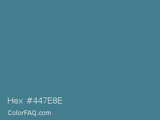 Hex #447e8e Color is a normal cyan color and the nearest color is Smalt Blue #51808f. Hex code #447e8e and RGB value is rgb(68,126,142). In RGB color space, this color is composed of 27% red, 49% green, 56% blue, In CMYK color space, this color is composed of 52% cyan, 11% magenta, 0% yellow , 44% black , In HSL color space, this color has a hue angle of 193° , 35% saturation and 41% lightness.