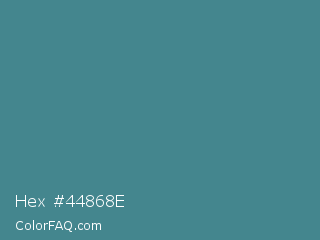 Hex #44868e Color is a normal cyan color and the nearest color is Smalt Blue #51808f. Hex code #44868e and RGB value is rgb(68,134,142). In RGB color space, this color is composed of 27% red, 53% green, 56% blue, In CMYK color space, this color is composed of 52% cyan, 6% magenta, 0% yellow , 44% black , In HSL color space, this color has a hue angle of 186° , 35% saturation and 41% lightness.