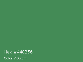 Hex #448b56 Color is a normal green color and the nearest color is Middle Green #4d8c57. Hex code #448b56 and RGB value is rgb(68,139,86). In RGB color space, this color is composed of 27% red, 55% green, 34% blue, In CMYK color space, this color is composed of 51% cyan, 0% magenta, 38% yellow , 45% black , In HSL color space, this color has a hue angle of 135° , 34% saturation and 41% lightness.