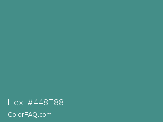 Hex #448e88 Color is a normal cyan color and the nearest color is Smalt Blue #51808f. Hex code #448e88 and RGB value is rgb(68,142,136). In RGB color space, this color is composed of 27% red, 56% green, 53% blue, In CMYK color space, this color is composed of 52% cyan, 0% magenta, 4% yellow , 44% black , In HSL color space, this color has a hue angle of 175° , 35% saturation and 41% lightness.