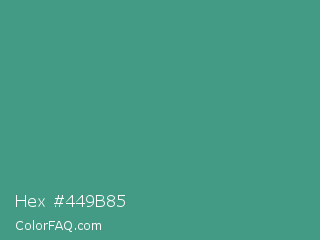Hex #449b85 Color is a normal cyan color and the nearest color is Zomp #39a78e. Hex code #449b85 and RGB value is rgb(68,155,133). In RGB color space, this color is composed of 27% red, 61% green, 52% blue, In CMYK color space, this color is composed of 56% cyan, 0% magenta, 14% yellow , 39% black , In HSL color space, this color has a hue angle of 165° , 39% saturation and 44% lightness.