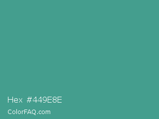 Hex #449e8e Color is a normal cyan color and the nearest color is Zomp #39a78e. Hex code #449e8e and RGB value is rgb(68,158,142). In RGB color space, this color is composed of 27% red, 62% green, 56% blue, In CMYK color space, this color is composed of 57% cyan, 0% magenta, 10% yellow , 38% black , In HSL color space, this color has a hue angle of 169° , 40% saturation and 44% lightness.