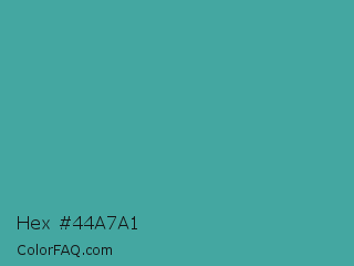 Hex #44a7a1 Color is a normal cyan color and the nearest color is Keppel #3ab09e. Hex code #44a7a1 and RGB value is rgb(68,167,161). In RGB color space, this color is composed of 27% red, 65% green, 63% blue, In CMYK color space, this color is composed of 59% cyan, 0% magenta, 4% yellow , 35% black , In HSL color space, this color has a hue angle of 176° , 42% saturation and 46% lightness.
