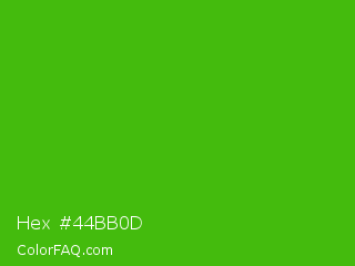 Hex #44bb0d Color is a normal green color and the nearest color is Kelly Green #4cbb17. Hex code #44bb0d and RGB value is rgb(68,187,13). In RGB color space, this color is composed of 27% red, 73% green, 5% blue, In CMYK color space, this color is composed of 64% cyan, 0% magenta, 93% yellow , 27% black , In HSL color space, this color has a hue angle of 101° , 87% saturation and 39% lightness.