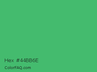 Hex #44bb6e Color is a normal green color and the nearest color is Medium Sea Green #3cb371. Hex code #44bb6e and RGB value is rgb(68,187,110). In RGB color space, this color is composed of 27% red, 73% green, 43% blue, In CMYK color space, this color is composed of 64% cyan, 0% magenta, 41% yellow , 27% black , In HSL color space, this color has a hue angle of 141° , 47% saturation and 50% lightness.