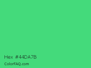Hex #44da7b Color is a normal green color and the nearest color is UFO Green #3cd070. Hex code #44da7b and RGB value is rgb(68,218,123). In RGB color space, this color is composed of 27% red, 85% green, 48% blue, In CMYK color space, this color is composed of 69% cyan, 0% magenta, 44% yellow , 15% black , In HSL color space, this color has a hue angle of 142° , 67% saturation and 56% lightness.