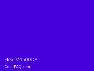 Hex #4500da Color is a normal indigo color and the nearest color is Interdimensional Blue #360ccc. Hex code #4500da and RGB value is rgb(69,0,218). In RGB color space, this color is composed of 27% red, 0% green, 85% blue, In CMYK color space, this color is composed of 68% cyan, 100% magenta, 0% yellow , 15% black , In HSL color space, this color has a hue angle of 259° , 100% saturation and 43% lightness.