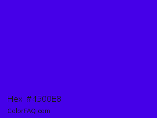 Hex #4500e8 Color is a normal indigo color and the nearest color is Electric Ultramarine #3f00ff. Hex code #4500e8 and RGB value is rgb(69,0,232). In RGB color space, this color is composed of 27% red, 0% green, 91% blue, In CMYK color space, this color is composed of 70% cyan, 100% magenta, 0% yellow , 9% black , In HSL color space, this color has a hue angle of 258° , 100% saturation and 45% lightness.