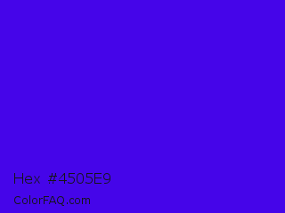 Hex #4505e9 Color is a normal indigo color and the nearest color is Electric Ultramarine #3f00ff. Hex code #4505e9 and RGB value is rgb(69,5,233). In RGB color space, this color is composed of 27% red, 2% green, 91% blue, In CMYK color space, this color is composed of 70% cyan, 98% magenta, 0% yellow , 9% black , In HSL color space, this color has a hue angle of 257° , 96% saturation and 47% lightness.